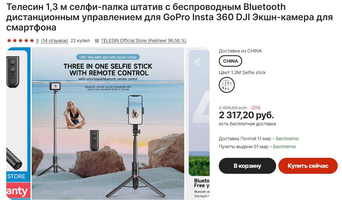 Селфи-палка-штатив Telesin tripod