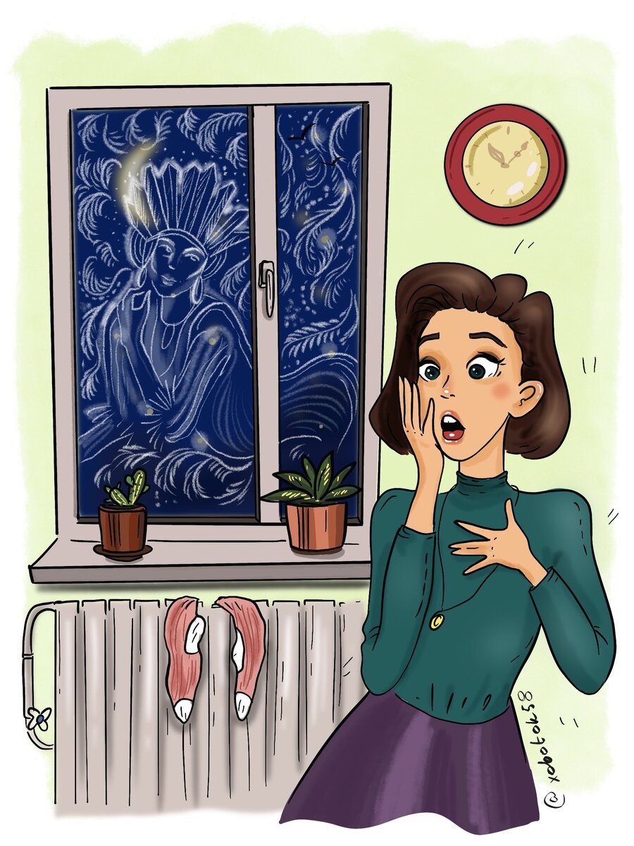 Обычно на окне появлялись тоненькие ледяные веточки, похожие на папоротник. И маленькие царапинки-перышки. Иногда, очень редко, узор был похож на миниатюрные елочки. Но сегодня на стекле было что-то другое. Среди всех этих перьев, елочек и веточек явно проступал силуэт женщины. На женщине было роскошное пышное платье и огромная корона.