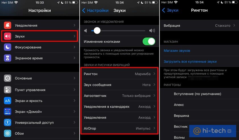 Войти в меню «Настройки».Перейти в «Звуки, тактильные сигналы».В разделе «Звуки и рисунки тактильных сигналов» (или «Звуки и рисунки вибраций») следует выбрать то, что требуется изменить.После этого нужно тапнуть на рингтон или звук предупреждения, чтобы прослушать его и установить в качестве нового сигнала оповещения на iPhone.Установка рингтона или звука для определенного контакта