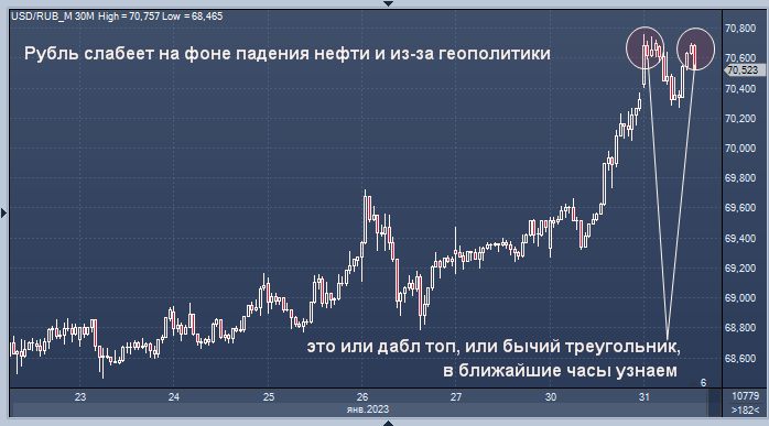 Есть опасения по поводу последствий установления потолка цен на нефтепродукты Курс доллар/рубля на Мосбирже интервалами в 1 минуту Курс доллар/рубля на Forex интервалами в 4 часа Рубль снижается третий день по отношению к доллару США, приближаясь к самому низкому уровню закрытия более чем за три недели. Российская валюта готовится к снижению по отношению к юаню вторую сессию. Рубль торгуется с понижением на 0,3% в Москве, торгуясь на уровне 70,5950/$ после ослабления на 1,3% в понедельник. По данным Росбанка, российской валюте удалось вчера только вырасти на утренней сессии, а к закрытию она снизилась. «В настоящее время в валютном сегменте преобладают негативные настроения», — говорится в сообщении московского банка. «Это связано с последовательным давлением в информационно-геополитической сфере, а также опасениями по поводу последствий установления потолка цен на нефтепродукты". Рубль упал на 0,3% по отношению к юаню до 10,4340 после снижения на 1,4% в понедельник. Вырос впервые за д