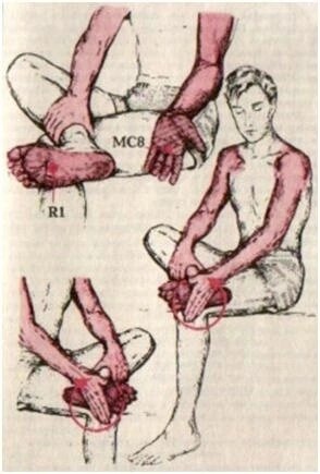 Следующее упражнение: садимся и начинаем делать массаж стоп. Можно делать их одновременно, можно по очереди сначала одну стопу, затем другую. Если стопы сухие, то смажьте их каким- либо маслом, например, оливковым. При обнаружении на стопах болевых точек, уделите им повышенное внимание. Особенно акцентируйтесь на центре стопы (смотрите рисунок). В конце разотрите ноги снизу доверху. Делаем 30 секунд или дольше.