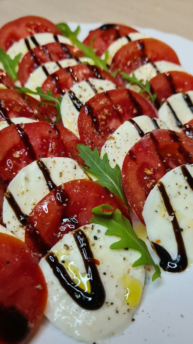 Салат "Капрезе" с руколой и соусом бальзамик — это интересный вариант классического итальянского блюда, обогащенный ароматной руколой и ароматным соусом бальзамик. Ингредиенты: Помидоры промойте, высушите и порежьте на кружочки примерно по 5 мм. Моцареллу порежьте ломтиками/слайсами толщиной примерно 7 мм. Зелень промойте и высушите. Выкладываем на блюдо по очереди разрезанные томаты и моцареллу. Салат приправляем солью и свежемолотым черным перцем. Опрыскиваем соусом и маслом. Сверху украшаем листиками руколы. Этот салат отличается простотой и свежестью вкуса. Рукола добавляет пикантности, а соус бальзамик подчеркивает аромат помидоров и моцареллы. Это отличное блюдо для летнего времени года и пикника. Капрезе - салат родом из Италии, с острова Капри, считается национальным блюдом. По внешним данным напоминает флаг Италии. Капрезе очень простой в исполнении и очень полезный салат. В томатах присутствует каротин, который хорошо усваивается благодаря жирам сыра. Приятного аппети