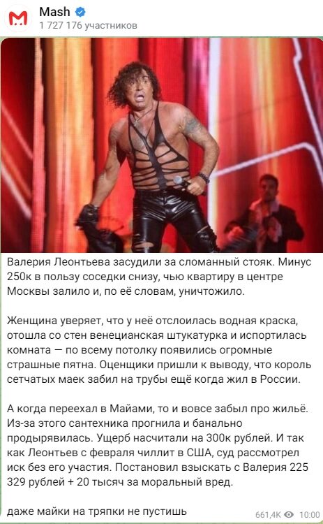 «Валерия Леонтьева засудили за сломанный стояк в его московской квартире», — сообщают в сети. Якобы суд взыскал с певца 250 тысяч рублей в пользу соседки снизу. Новость получила широкую огласку и разошлась по крупным телграм-каналам. Как на самом деле История оказалась фейком. Концертный директор певца Борис Чигирев опроверг слухи об иске против артиста. «Никогда такого не было. Я не знаю, о ком идет речь. Я не знаю ничего по поводу протечек. Возможно когда-то они и были, но суда и выплат точно не было. Это все вранье!» – заявил Чигирев журналистам. На портале судов Москвы можно найти иск против некоего В.Я. Леонтьева, но фигурирует в нем однофамилец певца. Мужчина, которого обвинили в затоплении квартиры соседки, отличается от артиста именем и отчеством. Валерий Леонтьев еще в прошлом году переехал в свой особняк в Майами и живет там. Источник опровержения РИА Новости: Представитель Леонтьева опроверг слухи об иске против артиста