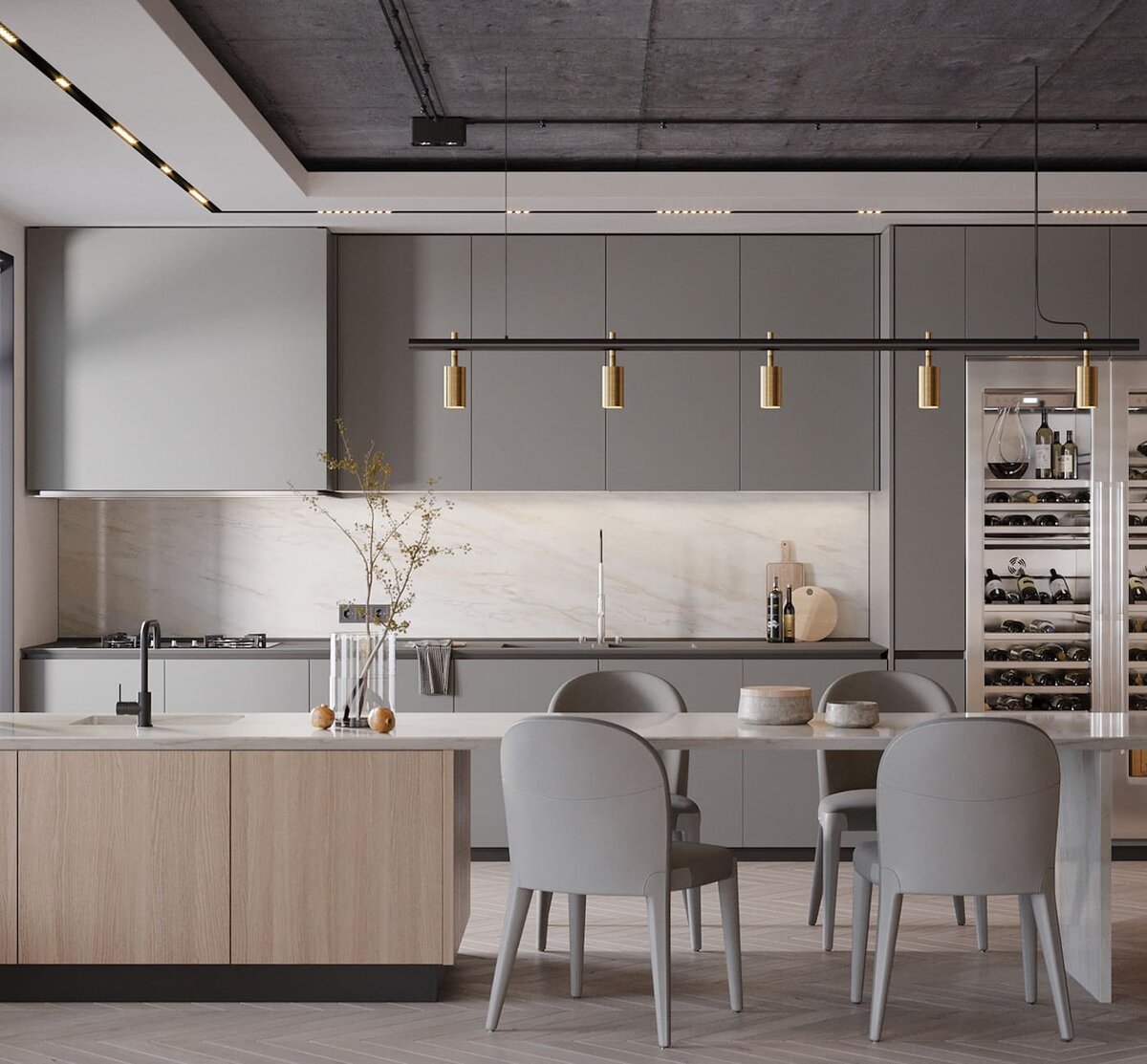 Столешницу и фартук кухни на заказ в 2023 году, зачастую, выбирают под дерево, бетон, мрамор. Эти оттенки прекрасно себя зарекомендовали, независимо от самого материала – камень, керамогранит либо пластик!
