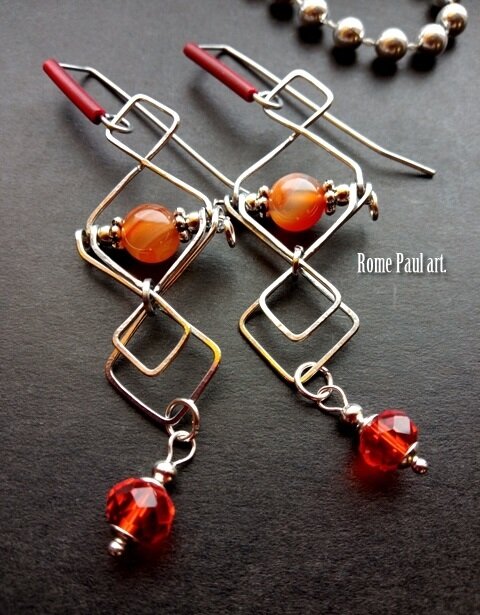 Лёгкие геометрические авторские серьги с натуральным сердоликом и хрустальными ронделями. Выполнены из кованой гипоаллергенной ювелирной стали. Яркий, выбивающийся из всех шаблонов, образ. Выразительный и комфортный аксессуар. Ручная работа. Оранжевый цвет минералов означает удачу и здоровье. По свойствам этот цвет символизирует энергию, радость, теплоту, смелость, а по качеству – это излучающий, сухой, теплый, взволнованный цвет. У колдунов самым могущественным цветом считается оранжевый цвет. Он связан с медициной, способен не только помочь восстановить силы, вызвать прилив жизненной энергии, но и укрепить волю. МАТЕРИАЛЫ: натуральный сердолик, хрустальные рондели, кованая ювелирная сталь Длина серьги: 85 мм ...Сердолик - сильнейший талисман любви, еще он отводит влияние злых людей и сущностей, приносит успех в делах и привлекает благополучие, отвлекая от хозяина врагов и недоброжелателей. Раскрывает природные дары человека, помогает найти свою стезю и призвание... ...Многие народы в