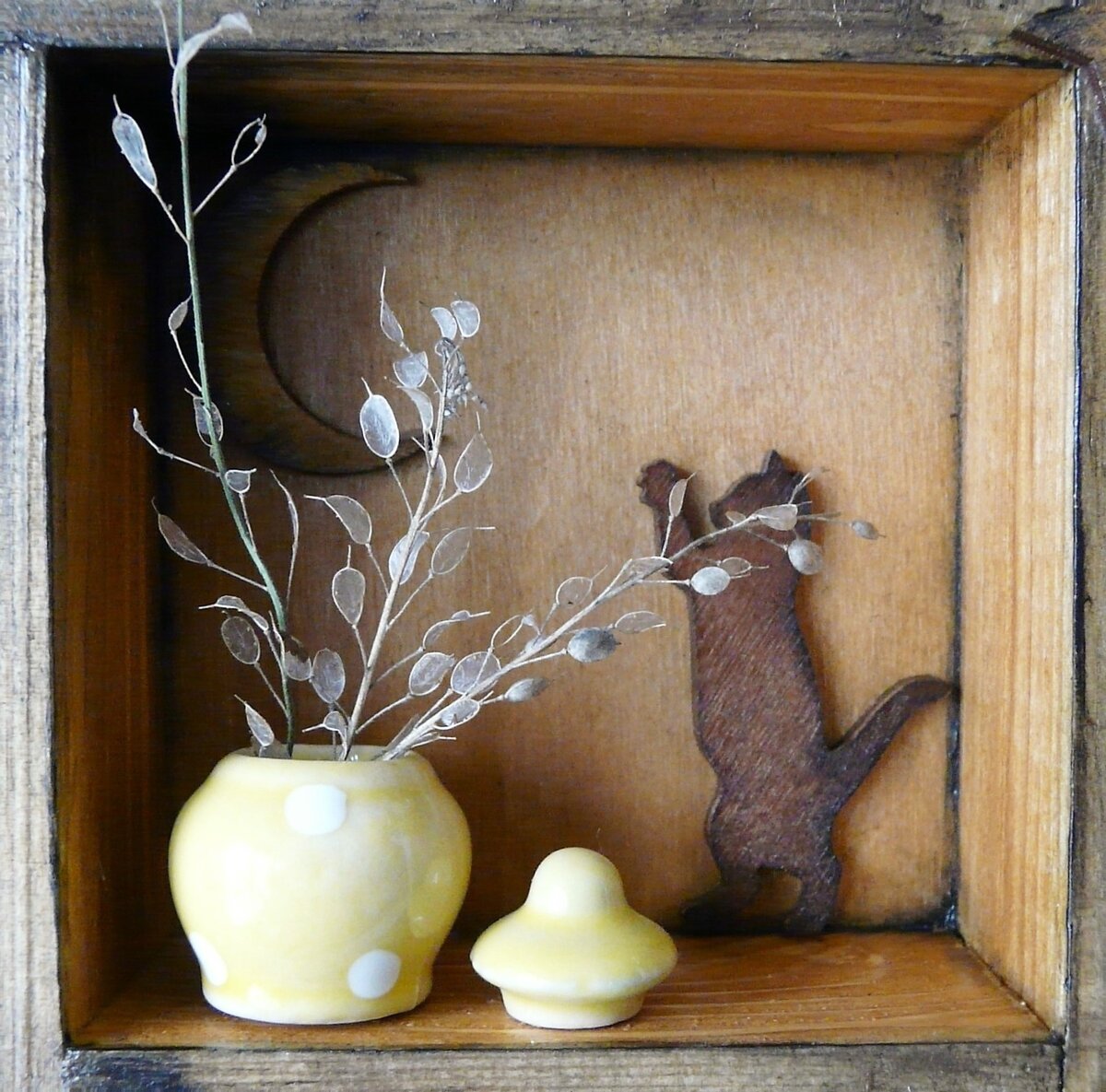 Оттенком более тёмным, чем сам шкафчик-витринка, покроем деревянные тельца кошек.