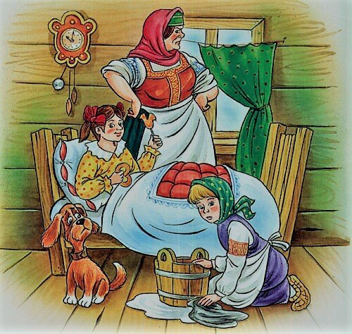 Жил дед да с другой женой. У деда была дочка и у бабы была дочка. Все знают, как за мачехой жить: перевернешься – бита и недовернешься – бита. А родная дочь что ни сделает – за все гладят по головке: умница. Падчерица и скотину поила-кормила, дрова и воду в избу носила, печь топила, избу мела еще до свету… Ничем старухе не угодить – все не так, все худо. Ветер хоть пошумит, да затихнет, а старая баба расходится – не скоро уймется. Вот мачеха и придумала падчерицу со свету сжить. – Вези, вези ее, старик, – говорит мужу, – куда хочешь, чтобы мои глаза ее не видали! Вези ее в лес, на трескучий мороз. Старик затужил, заплакал, однако делать нечего, бабы не переспоришь. Запряг лошадь: – Садись, милая дочь, в сани. Повез бездомную в лес, свалил в сугроб под большую ель и уехал. Девушка сидит под елью, дрожит, озноб ее пробирает. Вдруг слышит – невдалеке Морозко по елкам потрескивает, с елки на елку поскакивает, пощелкивает. Очутился над той елью, под которой девица сидит, и сверху ее спрашив