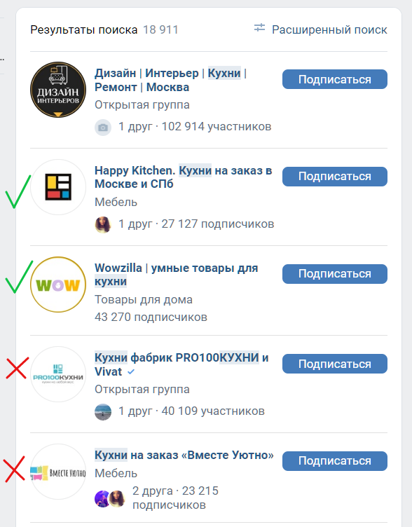 🔹Чтобы понять, какой аватар вам нужен, стоит пронализировать конкурентов. Введите в поиске по сообществам вашу тематику, посмотрите на их аватарки и сделайте/найдите что-то уникальное — вам нужно максимально выделяться в этом списке, чтобы людям захотелось кликнуть именно на ваше сообщество
