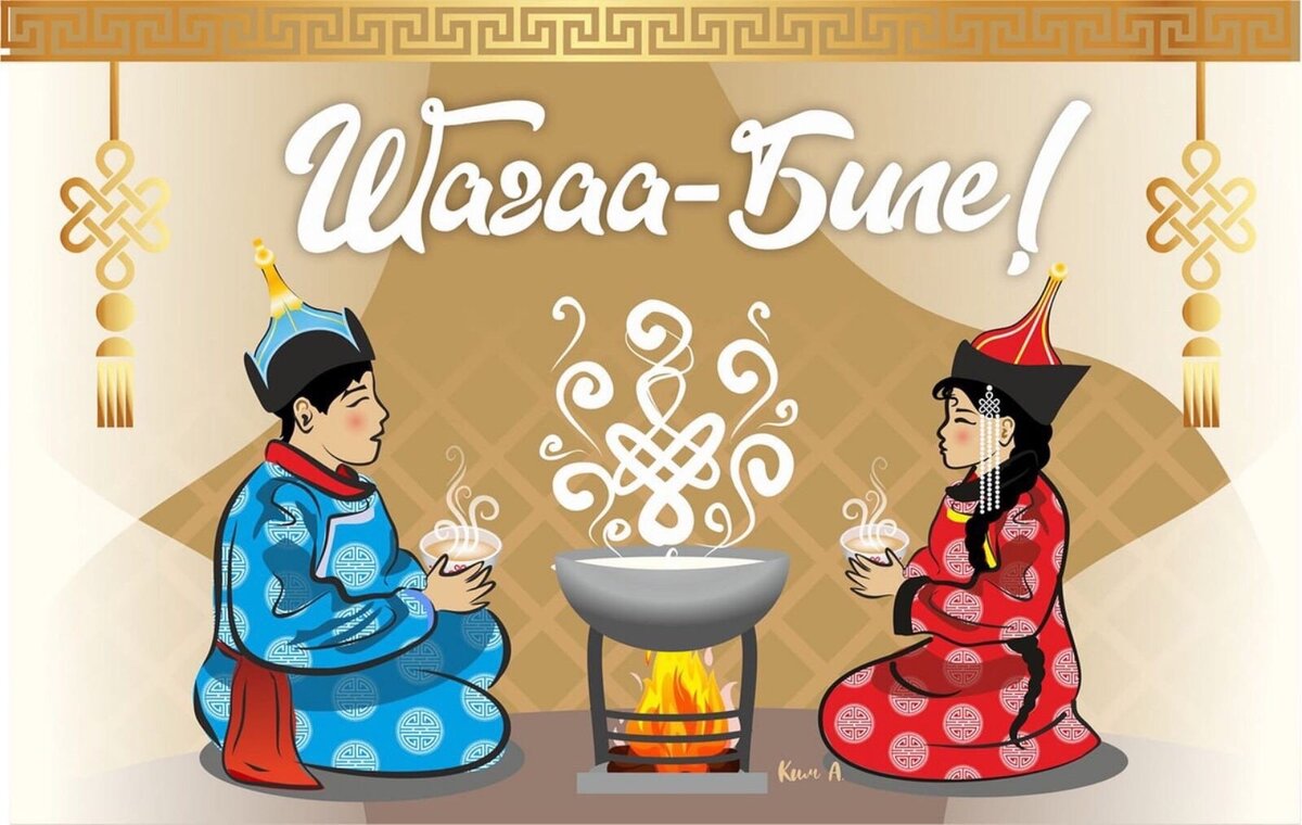 Эрте бурун шагдан Эки бакты көрген Ак-ла салдыг ирей Ажы-төлүн чыггаш, Чаңчылдарны айтып, Чагыг-сөзүн сөглеп, Саңын кыпсып чалбарааш, Чаа хүннү алгаан. Кожумаа: Курай-курай! Черим-чуртум! Өршээ-өршээ! Ажы-төлүм! Ада-иемниң чери-чурту өршээ! Ажым-чемин дээжизин салдым, өршээ! Аас-кежик дилеп тур бис, Шагаа, шагаа, алдын шагаа, Ак-ла салдыг алдын шагаа! Дээрде чыраан шолбан, Херелденген эзим, Эрги чыл-даа аттангаш, Эстип чиде берди. Арттар-сыннар кырын Алдын херел шыпты. Чаа муң чыл эгези Шагаа ныйыр келди. Кожумаа: Курай-курай, оран таңдым! Өршээ-өршээ, арбай-тараам! Бак-ла чүве ыңай турзун, өршээ! Эки-ле чүве бээр турзунам, өршээ! Амыр-тайбың дилеп тур бис, Шагаа-шагаа, алдын шагаа, Ак-ла салдыг алдын шагаа! Хондур-дундур тоолдап, Кожамыктап, кажыктап, Кожа өглер аалдап, Чолушкулап келир. Омак-хөглүг чонум О мани падме хум! Айым, хүнүм,бурганым, Авыралдап камна! Кожумаа: Курай-курай, оран-таңдым! Өршээ-өршээ, арбай-тараам! Бак-ла чүве ыңай турзун, өршээ! Эки-ле чүве бээр турзунам, өршэ