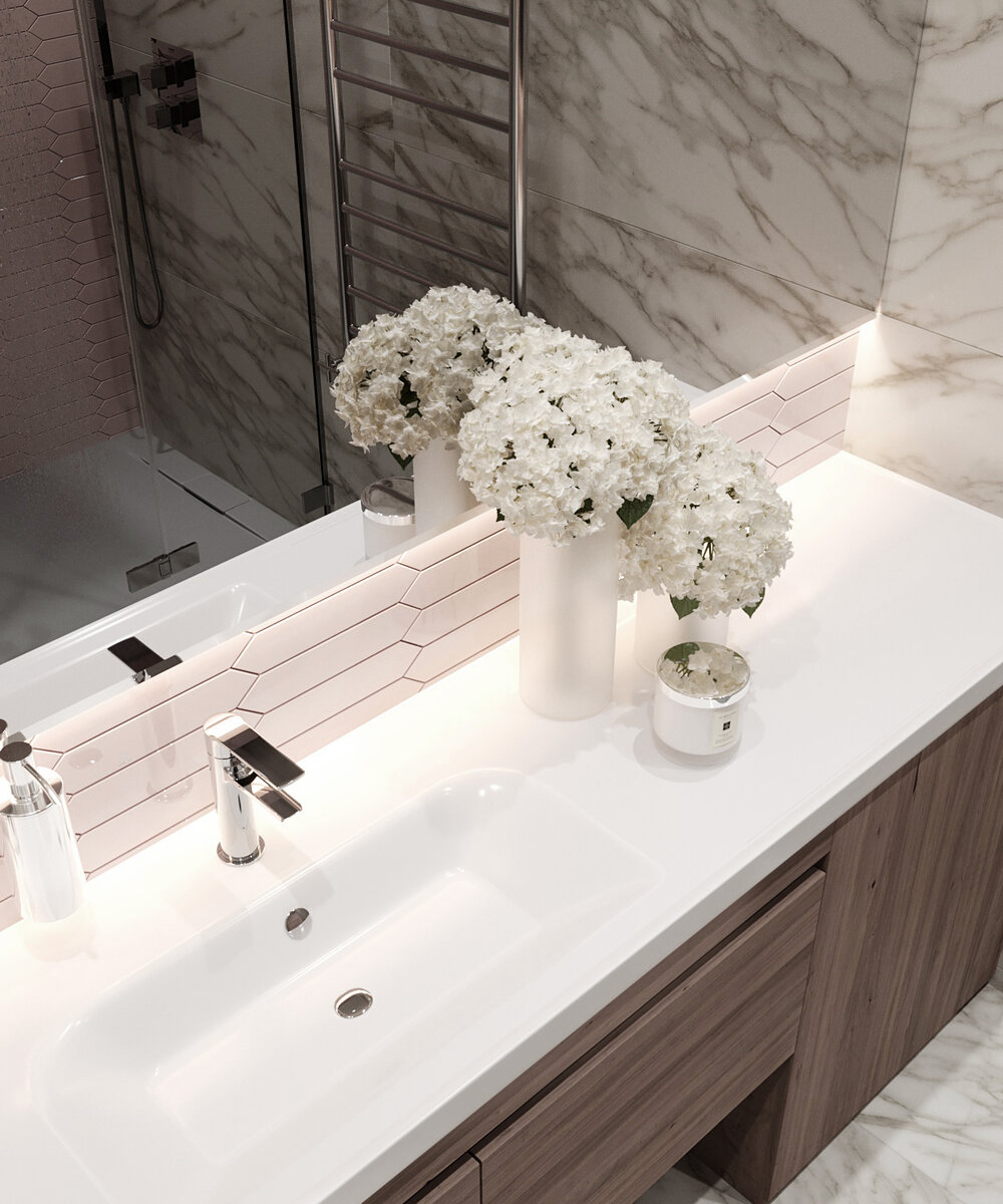 Заказчики проекта — семейная пара, пожелавшая обустроить в квартире площадью 62 м2 отдельную комнату для взрослой внучки, которая приходит к ним в гости. В помещении со свободной планировкой главной задачей было разместить функционально две жилые комнаты и при этом в ограниченном пространстве создать кухню-гостиную. Помимо этого удалось выделить место для гардеробной и раздельного санузла с душевой. Небольшое количество прямых стен, неудобные выводы мокрых зон и коммуникаций, а также большие потребности в размещении бытовой техники и шкафов, очень усложнили проект кухонной мебели. Несмотря на это, её удалось довольно гармонично вписать в интерьер. Дизайн получился в современном стиле с элементами неоклассики, в оформлении использовались белый мрамор, песочные и золотистые оттенки, дерево, а в санузле — нежно-розовая плитка. Золотая фурнитура и невесомые светильники из стекла добавляют элегантности и изящества. В кухне-гостиной барная стойка зонирует помещение, отделяя место отдыха от с