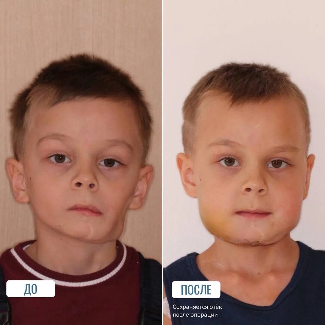 Ребенок 7 лет поступил в клинику Рогачёва после двух операций и года лечения в Турции. Диагноз: Рабдомиосаркома нижней челюсти слева, 1 год после реконструкции малоберцовым лоскутом. В Турции было проведено несколько операций, но пересаженный лоскут не соответствовал ни по форме (не соответствовал симметрии лица) ни по функции (не удерживал положение челюсти в центральной позиции), а так же был непригоден для последующего протезирования (недостаток костной ткани). А самое главное, что замещение дефектов васкуляризированными костными лоскутами в детском возрасте не рекомендовано, так как они подвергаются атрофии и в них нет потенции к росту. При этом операция сложная и травматичная с большим количеством осложнений. Нами была проведена сложная работа –несмотря на накопившуюся сильную вторичную деформацию, нам удалось одномоментно установить растущий протез и провести остеотомию с противоположной стороны (распиливание челюсти с перемещением в правильную позицию). Для возможности (совме