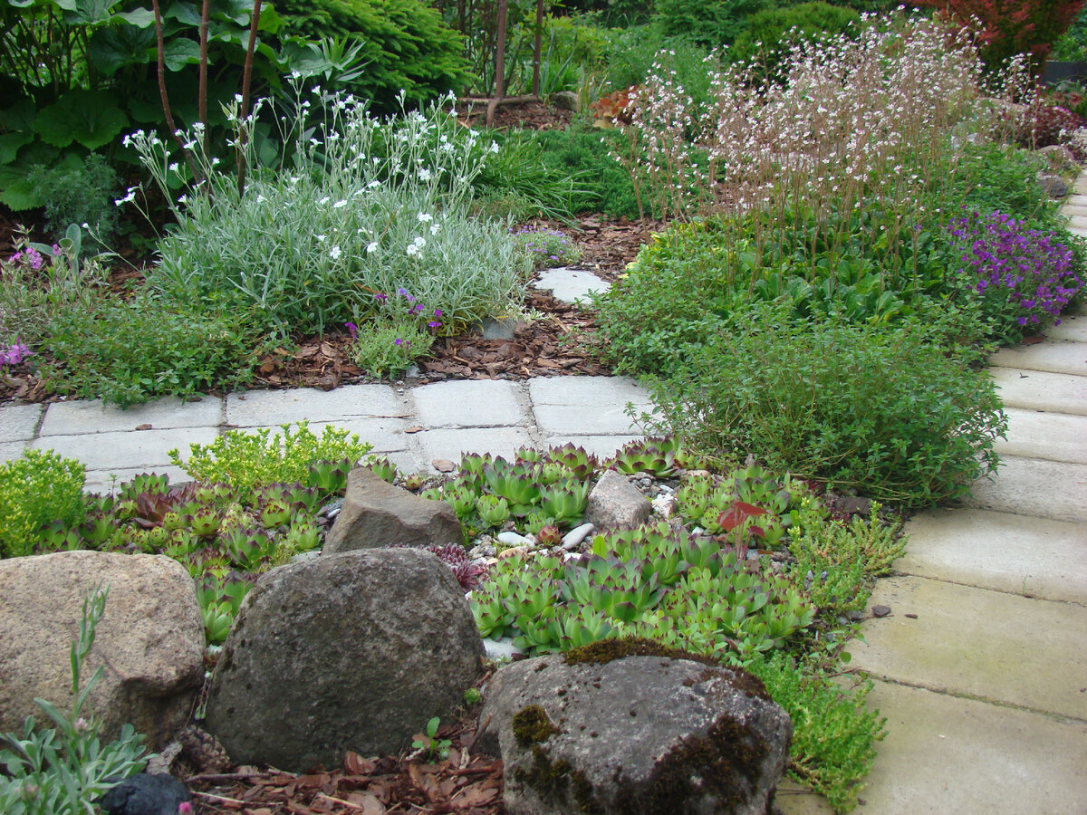 Мммммм... Я порылась, порылась в доступных мне источников, а их у меня не так много, и не нашла ни одного термина, который бы мог грамотно назвать цветники, о которых я сегодня хочу порассуждать. Наверное, они близки в чем-то рокарию. По принципу выбора растений, по использованию камня.