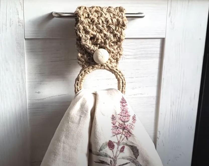Если да, то сейчас вы узнаете, как это сделать. Идея принадлежит мастерице, автору канала «Soulful_element». Держатель для полотенца связан из джутовой веревки, это прочный и очень доступный материал. Для того, чтобы этот аксессуар выглядел гармонично, определенно стоит связать из джута еще парочку интересных кухонных вещичек. Подумайте, что бы это могло быть? Итак, для этой работы вам потребуется совсем немного джутовой пряжи и вязальный крючок. Ну и конечно урок в формате видео, который вы найдете ниже.