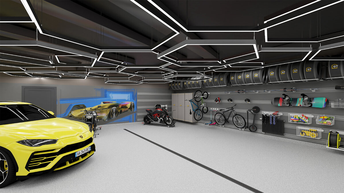 Форма гаража не классическая, и внутренняя отделка тоже не должна быть банальной. 😉 Клиент планировал художественное оформление на стенах, покраску потолка в темный цвет, а пол - максимально прочный и красивый. Обратившись к нам в ГаражТек, клиент получил комплексное решение: дизайн внутреннего пространства и предложение по обустройству. Для хранения задействуем кладовую и площадь справа от ворот. На остальном пространстве останется место для парковки 5 премиальных машин, багги, мотоциклов и квадроцикла. В подсобном помещении организуем рабочую зону с мощным двухметровым верстаком. Здесь же размещаем те вещи, которые часто могут быть нужны в доме. Велосипеды во время сезона будут стоять на организованной велопарковке. Когда сезон закончится, их перенесут на хранение на стенах. Клиент изначально рассматривал несколько вариантов финишного пола, но, в и