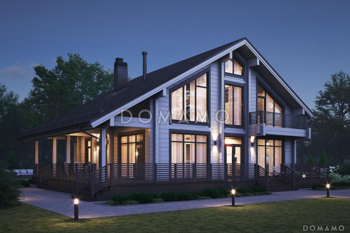 Из бревна, бруса, клееного бруса — есть несколько вариантов строительства деревянного дома для постоянного проживания. При соблюдении технологии, при правильной планировке и использовании качественных материалов дом из дерева будет ничуть не холоднее или не менее прочным, чем газобетонный или кирпичный. Приведем несколько примеров готовых проектов таких коттеджей. В подборке есть дома разные по этажности, площади и составу помещений. 1. Проект дома из клееного бруса с панорамными окнами и длинной террасой (D5643) На первом этаже традиционно размещена дневная зона: просторная кухня-гостиная с камином, вторым светом и окнами в пол, ведущими на террасу. Кроме этого, на этаже имеется спальня (17,5 кв. м) и вспомогательные помещения: санузел, кладовка, постирочная, котельная. На мансардном этаже выделены 3 спальни и санузел. Из холла открывается вид на гостиную внизу. Подобный дом можно построить за 5-9 млн р. Цену проекта и примерную стоимость строительства можно посмотреть на сайте: D5643