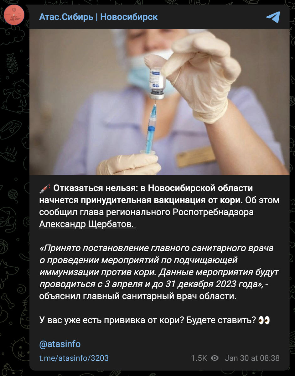 В Новосибирской области начнут принудительную вакцинацию от кори. В сети утверждают, что отказы от прививки приниматься не будут, о чем якобы сообщил глава регионального Роспотребнадзора. Как на самом деле Фейки о вакцинации всегда были одними из самых популярных. Чего только стоит целая армия антиваксеров и «вирусологов», активизировавшихся с приходом Covid-19. Понятное дело, что принудительно ставить прививки никто не будет. Свое опровержение выпустили в Управлении Роспотребнадзора по Новосибирской области. По словам ведомства, информация о принудительном характере вакцинации «не соответствует действительности». Прививать же будут ранее не привитых, не переболевших или не имеющих сведения о прививке жителей. Источник опровержения Новости Новосибирска: Роспотребнадзор НСО опроверг принудительную вакцинацию от кори.