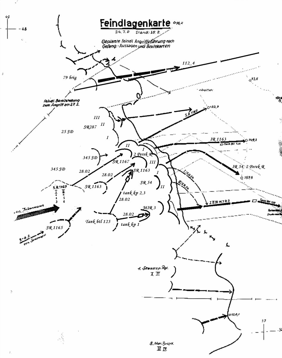 С немецкой точки зрения общий ход событий был следующим: из (ЖБД 24-й ПД) «28 2. 1942. Ночь на 28.02.42г. прошла тихо, наблюдением ничего не выявлено. Атаки противника начинаются в 6.30 в северном секторе. В 6.45 становится ясно, что противник атакует на широком фронте между ориентирами 4432 на севере (высота 115,7), и 4326 на юге («Лесная высота» в районе 4-й просеки). В районе 4360 были обнаружены 23 тяжелых танка. Для их уничтожения из штаба корпуса были запрошены самолеты «Stuka», однако их использование затруднено из-за плохой погоды» [5]. Тяжелых танков у СОР не было, более того, танки во второй день наступления не использовались, скорее всего, у немцев просто началась паника. И для этого была причина.