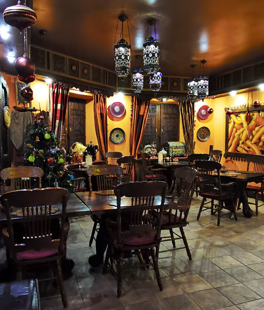По всему залу разбросаны аутентичные элементы декора: скульптуры, освещение, подсвечники, вазы, картины, посуда и т.д.