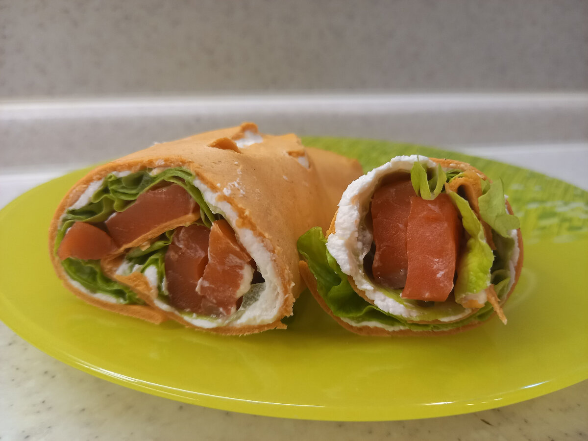 РУЛЕТИКИ с ТОРТИЛЬЕЙ Я покупаю тортилью (в наборе 5 круглых тонких лепешек) в магазине Вкус Вилл, с доставкой, т. к в магазине в наличии их почти не бывает или бывает светлая тортилья. Я покупаю зеленую (со шпинатом) и желтую ( с паприкой). Для этой закуски так же можно купить лаваш, но я не люблю лаваш. -его надо разрезать и он часто бывает "пластилиновый" Эта закуска может заменить вам ужин, а делается за 3минуты. 1 вариант из красной рыбы. Я покупаю в магазине "Красная икра" нерку холодного копчения. творожный сыр и листья любого салата. Эту закуска подойдет и для завтрака. Второй вариант я делаю из отваренного кусочка индейки. Для начинки вы можете добавить все, что вы любите. Я нарезала то, что было в холодильнике. фиолетовый лук, капуста, перец красный. Можно так же нарезать свежие огурцы или соленые. В качестве соуса у меня мамина аджика и сметана с чесноком. Делайте так, как нравится вам.