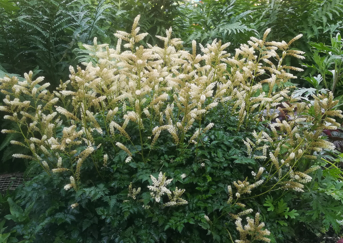 Волжанка или арункус, семейство Розовые, род Волжанка. Впервые я писала о ней в прошлом году вместе с другими волжанками. В отличие от своих сестриц, эта волжанка не высока. 35-45 см. В принципе, растение лесное. Вполне хорошо будет себя чувствовать в тени-полутени. Влажность определенная не помешает. У меня она росла на солнышке в белом цветнике. И прекрасно себя чувствовала. Но в прошлом сезоне была настолько яркой, что понятно стало, что она там лишняя. Вот здесь в центре она и росла до пересадки. Куст был весной и летом во время цветения очень декоративен сам по себе, но выбивался из общего ряда, нарушал гармонию. Ранней весной был пересажен в будущий цветной бордюр. Мне казалось, что он здесь будет хорошо смотреться, солировать будет. Пока он набирал зелень, было вроде не так плохо. Но рядом набирали зелень соседи. Раскручивались вайи папоротников. И вид менялся... По сторонам от куста поселялись разноцветные кустики, формировался бордюр. А волжанка росла. Почва здесь живая, сл