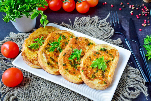 СОСТАВ / ИНГРЕДИЕНТЫ Изменить состав порций: Батон 250 гркг Яйца 2 гршт.чайн.л.стол.л.десерт.л. Молоко 150 гркглмлстак.стол.л.десерт.л. Твёрдый сыр 50 гркгстак. Растительное масло 20 грлмлстак.чайн.л.стол.л.десерт.л. Петрушка по вкусу Соль по вкусу Специи сухие по вкусу Таблица перевода объемных мер Нутриенты и энергетическая ценность состава рецепта На вес состава: в одной порции (197 г) во всех порциях (590 г) 100 г Белки 21%9 г Жиры 24%10 г Углеводы 55%23 г 226ккал ГИ: 5/0/95 Узнай калорийность и вес готового блюда Как узнать, свежее ли яйцо? Разбейте его в отдельную емкость. В первую очередь должен отсутствовать неприятный запах. Белок свежих яиц будет прозрачным и чистым. Желток не должен растекаться и будет блестящим, выпуклым, однородным. Обязательно мойте яйца перед использованием, так как даже на кажущейся чистой скорлупе могут находиться вредные бактерии. Лучше всего использовать моющие средства для пищевых продуктов и щетку. Проверить, достаточно ли хорошо масло разогре
