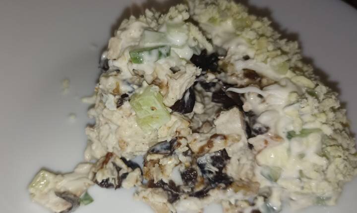 Необычное сочетание продуктов, интересный вкус, быстрый в приготовлении и недорогой. Вкусный, нежный слоеный салат с куриным филе, свежим огурцом, черносливом и грецким орехом. Нам потребуется: Куриное филе отвариваем и измельчаем. Можно разделать на волокна или просто мелко нарезать. Солим, перчим, добавляем немного майонеза и перемешиваем. Равномерно распределяем по дну салатника – это будет первый слой нашего салата. Чернослив запариваем кипятком на 7-10 минут, затем хорошо промываем под проточной водой. Просушиваем, мелко режем и выкладываем следующим слоем. Смазываем майонезом. Ядра грецкого ореха измельчаем и посыпаем сверху чернослив. Совсем в крошку орехи мельчить не нужно, иначе они будут незаметны в салате. Яйца отвариваем, разделяем на белки и желтки и протираем через мелкую терку. На орехи распределяем белок. Солим и мажем майонезом. Мелко режем свежий огурец. Если огурец крупный достаточно будет и половины. Выкладываем следующим слоем, солим и снова промазываем майонезом.
