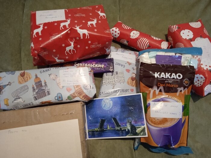 Основной новогодний обмен только один, а подарков хочется больше) В комментариях договорилась обменяться с Анной @alamery, и вот через 2 недели сборов подарки были отправлены и через пару дней уже можно было получать) 3, 5кг! Жирненький подарок, подумала я, и так и оказалось) Открытка с солнечным приветом из Питера и куча подарков в радостной новогодней и забавной питерской бумаге, некоторые свёртки очень увесистые) Гора вкусняшек, местных и иностранных: мои любимые колбаски, какао и другие согревающие напитки, пухлый кролик - символ года, батончики, фиолетовые чипсы, креветочные (!) чипсы, японские мини шоколадки - чего только нет. Но самое главное в коробке по центру - моя отправитель работает в пищевой промышленности и занимается разработкой новых вкусов продуктов - и вот это они, эксклюзивные вкусы, которых ещё нет в продаже, в банках с заклеенными этикетками, чтобы я сама угадала, что это за вкус!!! Это такой восторг, самый уникальный подарок, который я получала!!! Но и это ещё не