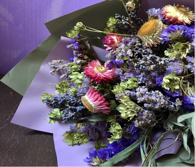 Поздней осенью и зимой, когда живых цветов мало, их с успехом могут заменить букеты из веток кустарников и деревьев с плодами (рябина, бирючина, шиповник, снежноягодник, лиственница, ольха и другие). А также из различных сухоцветов (акроклинум, аммобиум, гомфрена, физалис, статица, рогоза), листьев и соцветий диких трав или просто имеющих красивые контурные очертания (липа, дуб, береза). Хороши зимние букеты из веток березы, осины, клена, с листьями яркой осенней раскраски. Чтобы листья сохранялись на ветках в своем естественном виде, их немного подсушивают, а затем проглаживают горячим утюгом. Букеты из сухого материала можно ставить в вазы. Но гораздо интереснее и оригинальнее получаются букеты - композиции на куске коры, ветке дерева, на грибе-трутовике или камне. Кусок коры старого дерева должен быть прочным, с неровными обломанными краями и поверхностью, покрытой глубокими трещинами. Ветки с плодами, колоски злаков и другой материал закрепляются на нем при помощи пластилина, котор