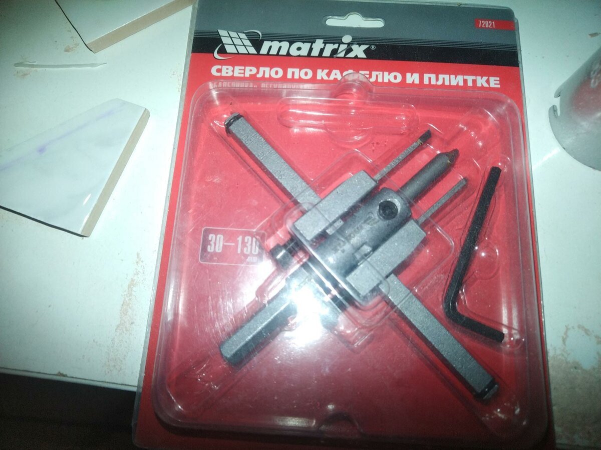Вчера пробовал в работе новый для себя гаджет - сверло-балеринка по керамике (фирмы Matrix). Сверло состоит из осевого (заменяемого) сверла и пары подвижных резцов, которые перемещаются по поперечной планке (на которую нанесена разметка). Фиксируются эти резцы винтами с головкой под шестигранник. Отверстия ей можно сверлить в диапазоне от 30 до 130 мм. Как раз 130 мм мне и понадобилось (под канализационную трубу). В принципе, в процессе настройки ничего особенного нет - резцы разводим на одинаковое расстояние от центра, ориентируясь на разметку, поджимаем винтами и ставим в шуруповерт. Сверлить желательно на малых оборотах. Кстати, получается очень громко. Скрипит, как будто, его убивают )))). На фото видно, что при полном раздвижении резцов в разные стороны, царапины от них отличаются. То есть, разметка немного привирает. Пришлось подстраивать более точно. В процессе работы пару раз ослаблялись винты и приходилось их снова подтягивать. Затянуть сильно не позволял металл ключа - с