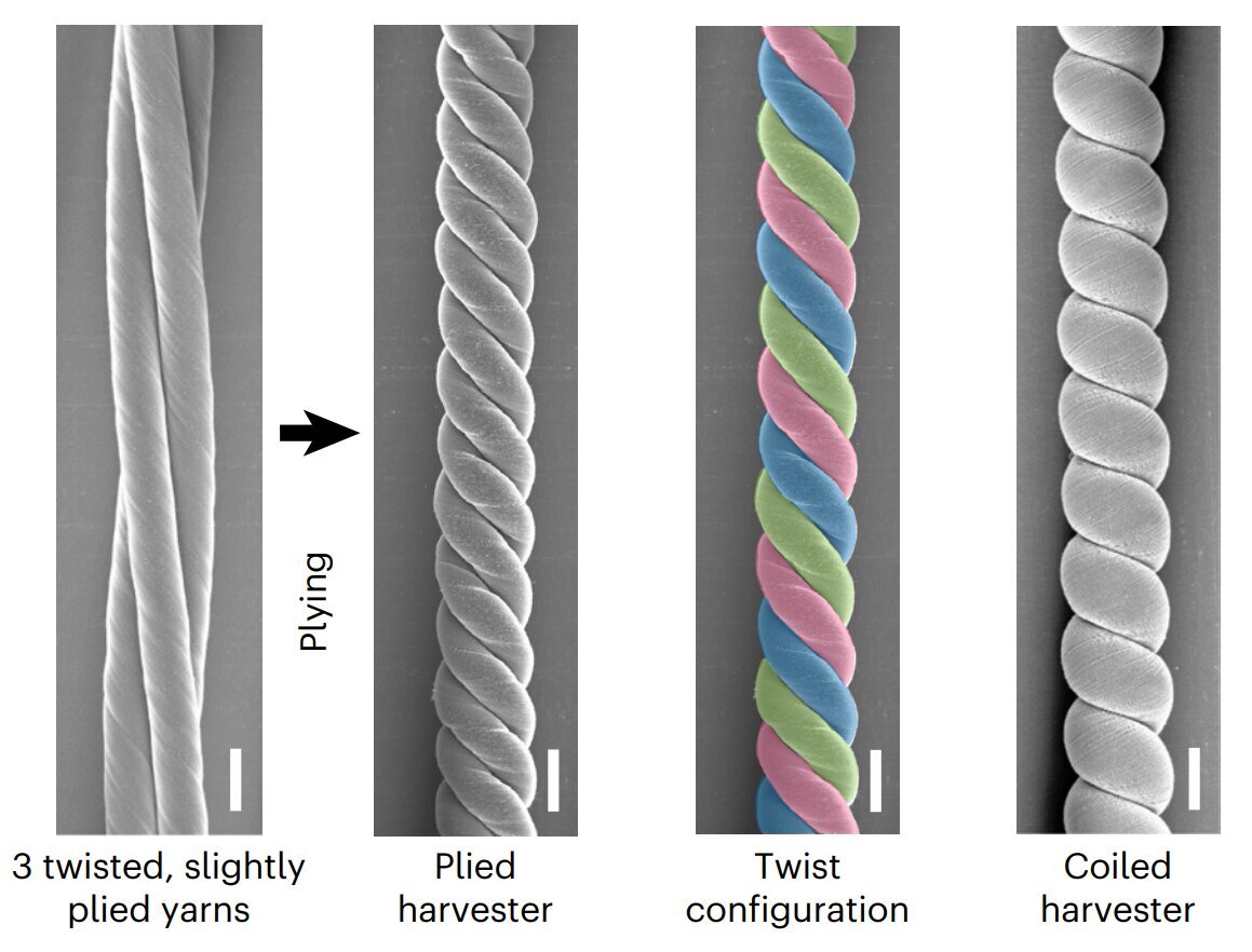 Исследователи в области нанотехнологий из Техасского университета в Далласе создали новые нити из углеродных нанотрубок, которые преобразуют механическое движение в электричество более эффективно, чем другие сборщики энергии на основе материалов. В исследовании, опубликованном 26 января в журнале Nature Energy , исследователи из Далласского университета штата Юта и их сотрудники описывают усовершенствования высокотехнологичной пряжи, которую они изобрели под названием «твистроны», которые генерируют электричество при растяжении или скручивании. Их новая версия очень похожа на традиционную шерстяную или хлопчатобумажную пряжу. Твистроны, вшитые в ткань, могут ощущать и улавливать движения человека; при развертывании в соленой воде твистроны могут собирать энергию от движения океанских волн; а твистроны могут заряжать даже суперконденсаторы. Впервые описанные исследователями UTD в исследовании, опубликованном в 2017 году в журнале Science , твистроны сконструированы из углеродных нанотру