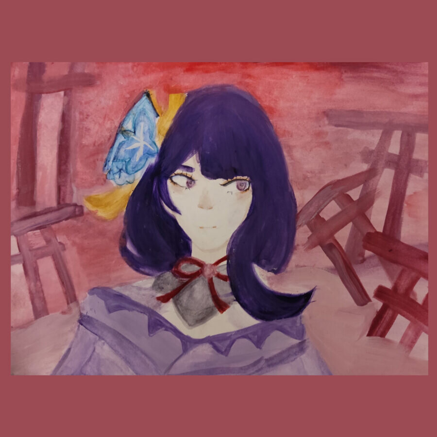 Это Райден Эи. Я уже когда то выкладывала рисунок про неё, но он был небольшой, формата А5. Я играю в Геншин уже более года, и вот я опять нарисовала свою любимку. Начала я играть 9 сентября 2021 года. Тогда же и появилась Райден в игре, мне очень понравился этот персонаж.