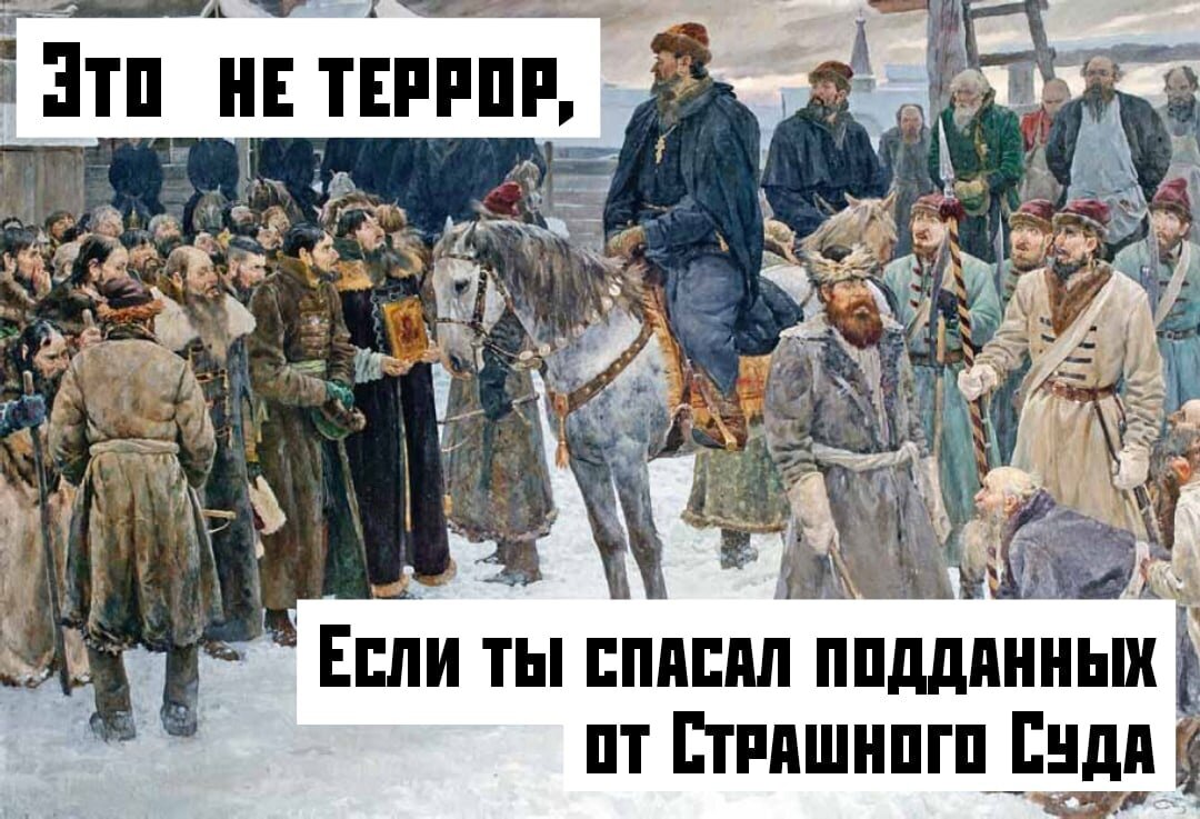 Итак, Грозный к 1560-м уверен в том, что а) он ответственный за подданных; б) он может использовать любые методы, чтобы спасти их души. Бомбическая смесь.