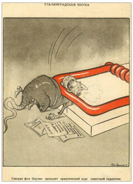 Карикатура Бориса Ефимова на фельдмаршала Паулюса. 1943. Кстати, Ефимов называет Паулюса «фон Паулюс» — распространённая ошибка, Паулюс дворянином не был. И когда его при пленении тоже назвали «фон», сразу поправил говорившего