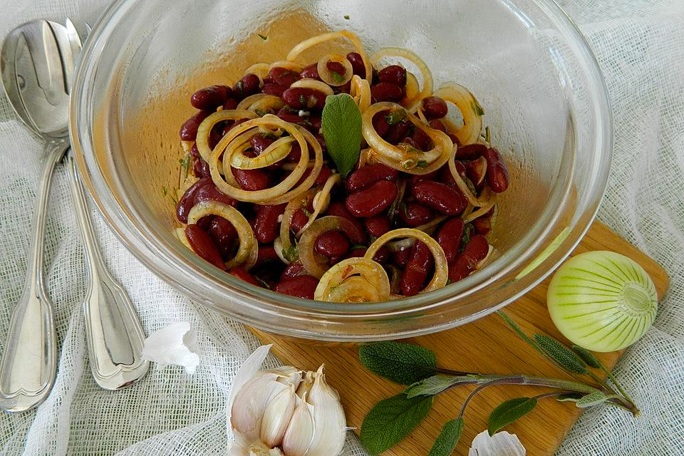 То, что «в испанском стиле» я взял в кавычки – не случайно, потому что если быть честным, испанских следов и корней лично я в нем не нашел. Разве что использование паприки – так какая кухня ее не использует? Но у этого салата есть достоинства – он сытный, вкусный, может подаваться как в холодном, так и в теплом (как случайно выяснилось) виде. Берем: Как готовим: Лук нарезаем кольцами или полукольцами, чеснок рубим. Смешиваем с фасолью. Делаем заправку – взбиваем кетчуп, уксус и масло с рубленым шалфеем, солью, перцем и паприкой. Заправляем наш салат и оставляем на полчаса-час пропитаться заправкой. Приятного аппетита!