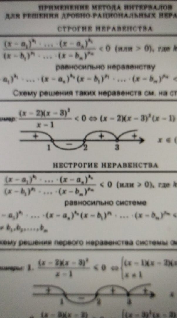 Суть метода интервалов заключается в том, что при переходе с одного промежутка на другой между корнями функция меняет знак. А решение неравенств - нахождение всех точек, где функция больше или меньше нуля. Это зависит от неравенства. Решение неравенств методом интервалов удобно, когда видны корни - действительные числа. Вся числовая прямая делится на промежутки. Концами этих промежутков являются корни неравенства. Точки рисуются пустыми если неравенство строгое (больше, меньше) или закрашенными, если не строгое больше или равно, меньше или равно нулю. Алгоритм решения неравенств: 1. Записать неравенство в стандартном виде. Для этого надо приравнять к нулю функцию и найти корни. Или записать в стандартном виде: (х - х1)(х - х2) ...(х - хт) больше, меньше 0 2. Нарисовать числовую прямую. Отметить точки выколотые (или закрашенные) в зависимости от того, принадлежат точки (или нет). То есть строгое или нет неравенство. 3. Выбрать участок с плюсом, если больше нуля, или с минусом, если ме