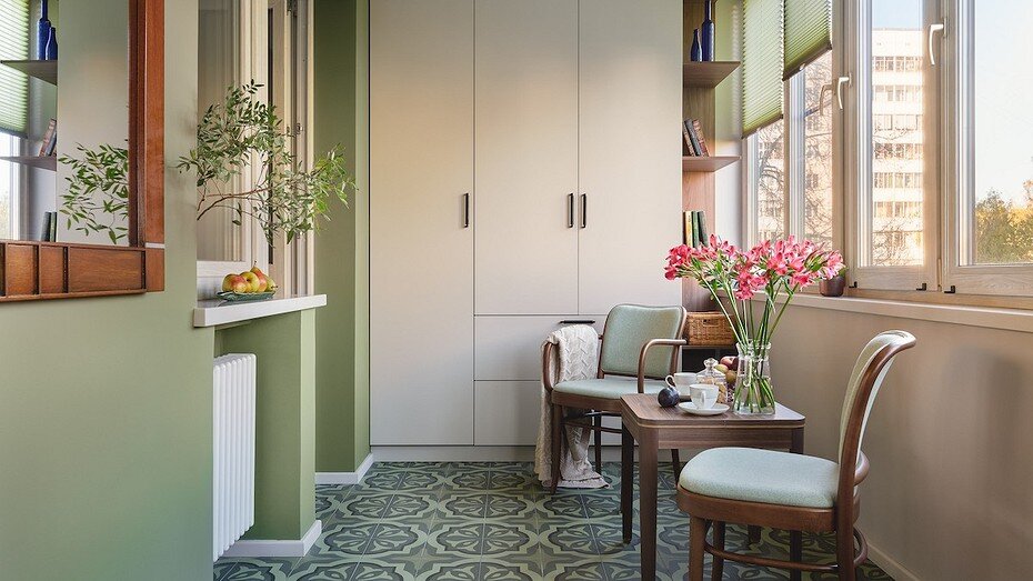 До ремонта в квартире был традиционный интерьер начала века — открытые цвета, линолеум на полу и плитка с устаревшей имитацией мрамора в ванной. Сегодня это пространство не узнать! Фото: Наталья Вершинина Заказчик и задачи Владелица этой квартиры — женщина, юрист с многолетним стажем, которая увлекается шитьем. С дизайнерами Марией Поветкиной и Юлией Парфеновой хозяйка уже сотрудничала ранее, поэтому, когда снова встал вопрос ремонта, в выборе специалистов не сомневалась. Задачей было оформить новое пространство — светлое, воздушное, при этом вписать часть мебели и декора, которые хозяйка хотела оставить, и сохранить функциональность всех зон. Также владелица хотела оставить кондиционеры, которые были в квартире. Перепланировка В квартире — кухня, две комнаты и односторонняя планировка, то есть все окна выходят на одну (в этом случае солнечную) сторону. Большая комната отведена под спальню, а поменьше — под гостиную и зону спорта. Из кухни и спальни есть выход на просторную лоджию (фак