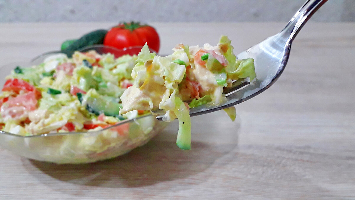Несколько лет назад, мне подписчица прислала рецепт этого салата. С тех пор готовлю его часто. Вкусный, не дорогой. Много овощей, что полезно для организма, и мясо, без которого сытым не будешь. Если вы, как и я, не можете и дня прожить без вкусных салатов, приглашаю к себе на кухню, где расскажу и покажу, как я готовлю салат из пекинской капусты с курицей. ВИДЕО РЕЦЕПТ: ПОШАГОВЫЙ РЕЦЕПТ С ФОТО: Пекинскую капусту шинкую и перекладываю в глубокую чашу. Соломкой нарезаю свежий огурец и добавляю к капусте. Для салата потребуются мясистые помидоры, с малым содержанием сока. Если нет таких помидоров, удалите сердцевину с семенами, чтоб салат не "плавал". Нарезаю помидоры соломкой и добавляю в чашу. Мелко нарезаю вареные яйца и отправляю к остальным ингредиентам. Заранее отваренную куриную грудку нарезаю на кубики и выкладываю в чашу. Из специй потребуется соль и черный молотый перец. Перемешиваю все ингредиенты. Перед подачей добавляю майонез и снова перемешиваю. Майонез у меня свой, домашн