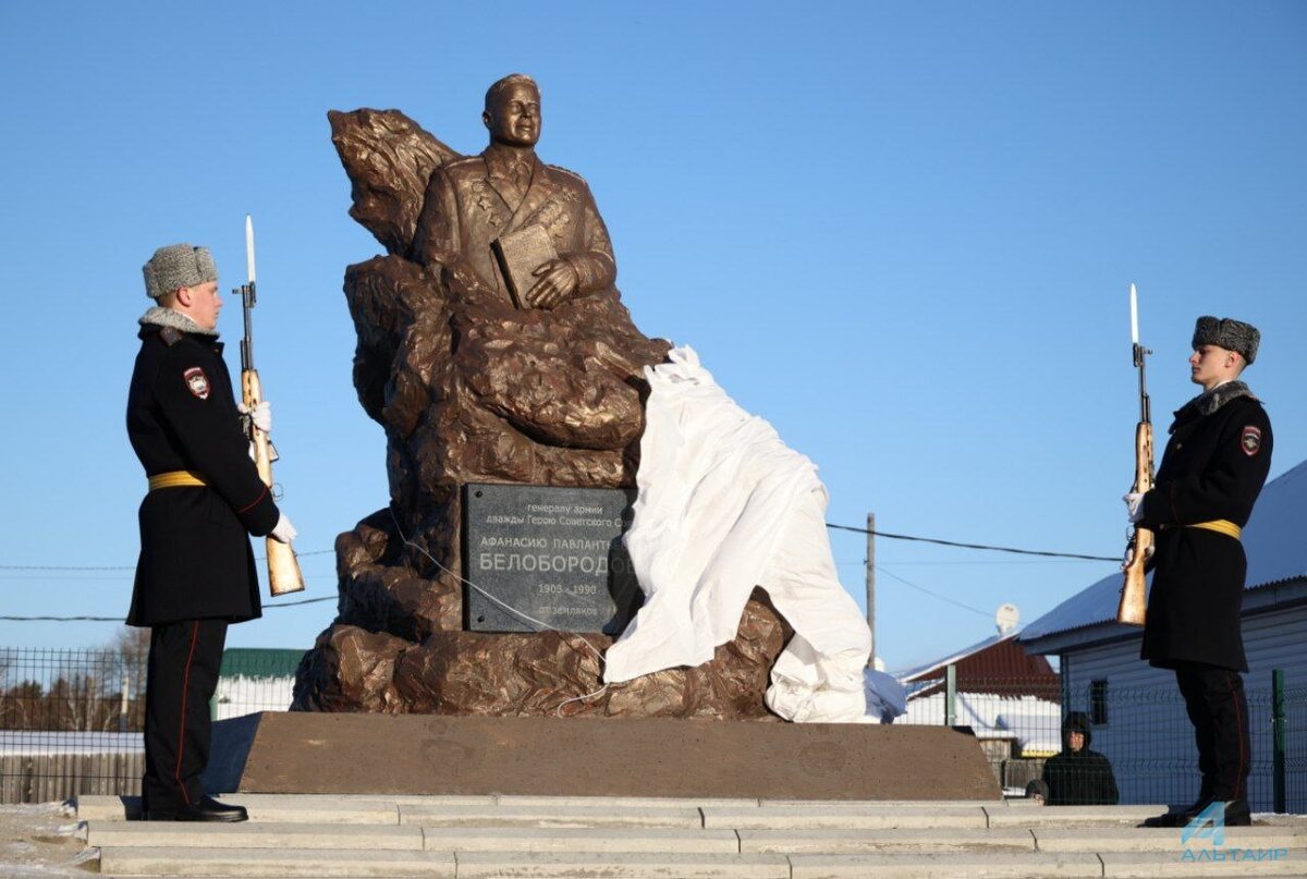 Губернатор Иркутской области Игорь Кобзев 31 января принял участие в торжественной церемонии открытия памятника дважды герою Советского Союза, генералу армии Афанасию Белобородову. Монумент установили на родине полководца – в селе Баклаши Шелеховского района. – Юбилей Афанасия Павлантьевича Белобородова – очень значимое событие не только для жителей Баклашей. Праздник имеет значение для всей Иркутской области, жители которой помнят своих героев, ценят и берегут память о них. 120 лет назад родился человек, который вошёл в историю Великой Отечественной войны, историю развития вооружённых сил Советского Союза. Он герой нашего времени, патриот своей родины, с которого нужно брать пример, – отметил Игорь Кобзев. Монументальная композиция представляет собой скульптуру высотой 2,8 метров. В центре – фигура Афанасия Белобородова, водружённая на рельефный постамент, который олицетворяет сибирскую землю, родину полководца. Легендарный генерал изображён по пояс, в парадном кителе с наградами и кн