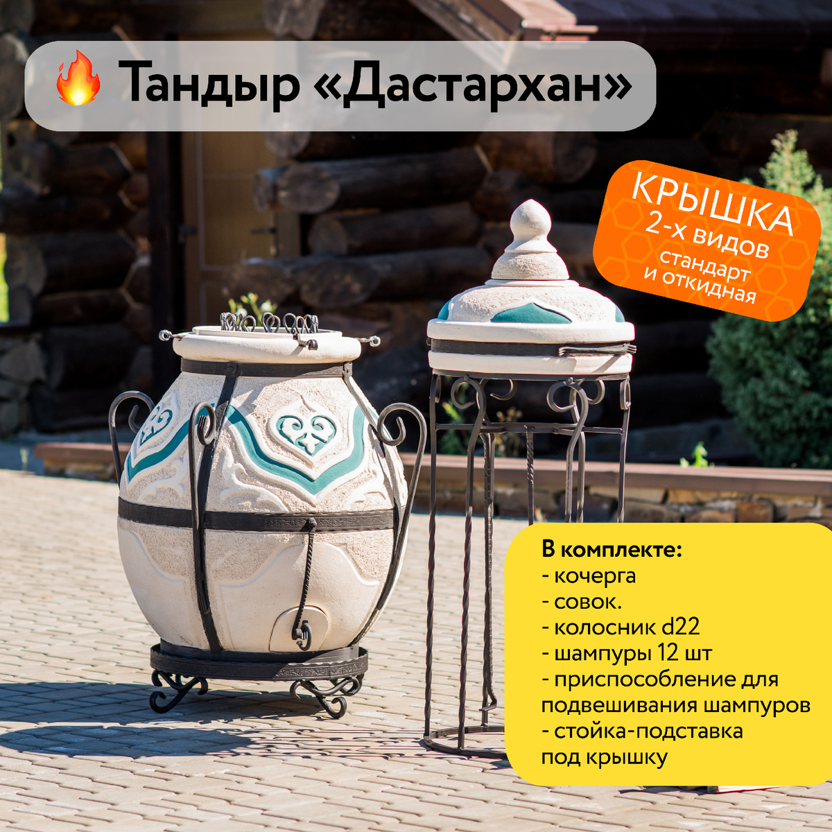 Друзья, всем привет, на связи Казан-Маркет. Прошли праздничные выходные, и мы входим в наш обычный режим работы. Мы очень соскучились по вам, и подготовили много интересного. Ну а пока давайте продолжим знакомство с нашими Тандырами. Этого красавца зовут “Дастархан” Дастархан это тандыр, который объединяет стремление людей собраться вместе. расположиться удобно, сесть вокруг по периметру на легкой стеганой тушаке и участвовать в трапезе. В Европе понятие дастархан не просто стол, а целое действо, событие и ритуал совместное яство в среднеазиатских традициях. В любом случае для общего застолья вкусные блюда можно приготовить в этом тандыре. Для порадовать солидную компанию, в комплекте большое число шампуров. Для длительного хранения тепла толщина стенок увеличена. Отличительной особенностью этой модели является необычный цветовой орнамент. Предполагается, что этот тандыр стационарный. Солидный вес не предполагает быстрых перемещений. Ему лучше занять свое стабильное место на даче либо