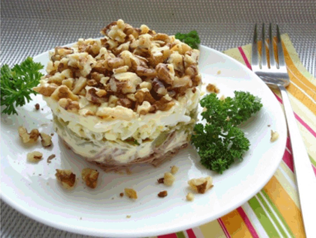 Нам понадобится 2 варёных окорочка, 6 варёных яйца, 2 яблока, 100 гр сыра. Все слои промазываются майонезом. 1 слой - лук, нарезанный полукольцами, пропущенный в масле. 2 слой - мелко порезанное мясо. 3 слой - яйца, натертые на крупной тёрке. 4 слой - яблоки натертые. 5 слой - сыр, натертый на крупной тёрке. Верх намазать майонезом и украсить грецкими орехами. Салат готов!