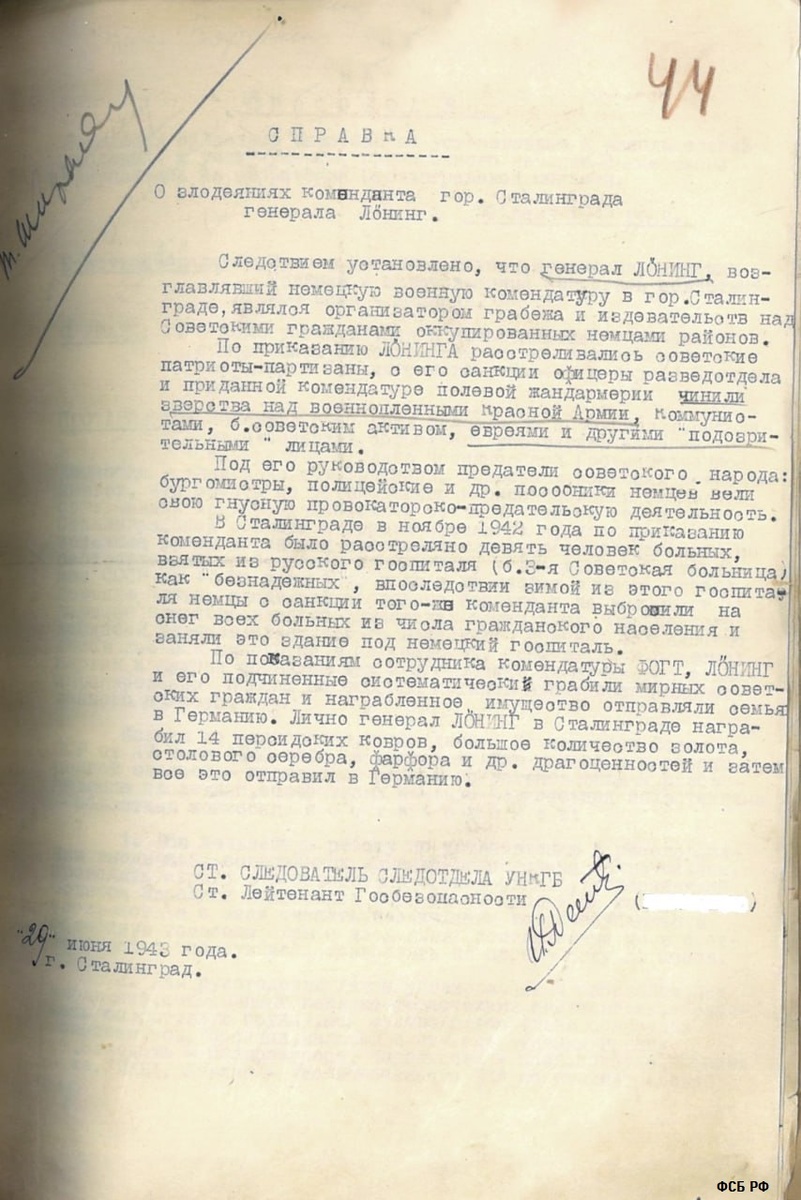 К 80-летию Сталинградской битвы ФСБ России обнародовала новые свидетельства преступлений гитлеровцев во время ВОВ. Ведомство представило ряд архивных материалов. Согласно документам, солдаты вермахта вламывались в жилища мирных людей и забирали все, что находили — даже детскую одежду. Отмечены случаи, когда при ограблении с женщин снимали платья, туфли, чулки, а детей оставляли голыми мерзнуть на улице. Представлены данные по разрушенным в массовом порядке школам, больницам, библиотекам.