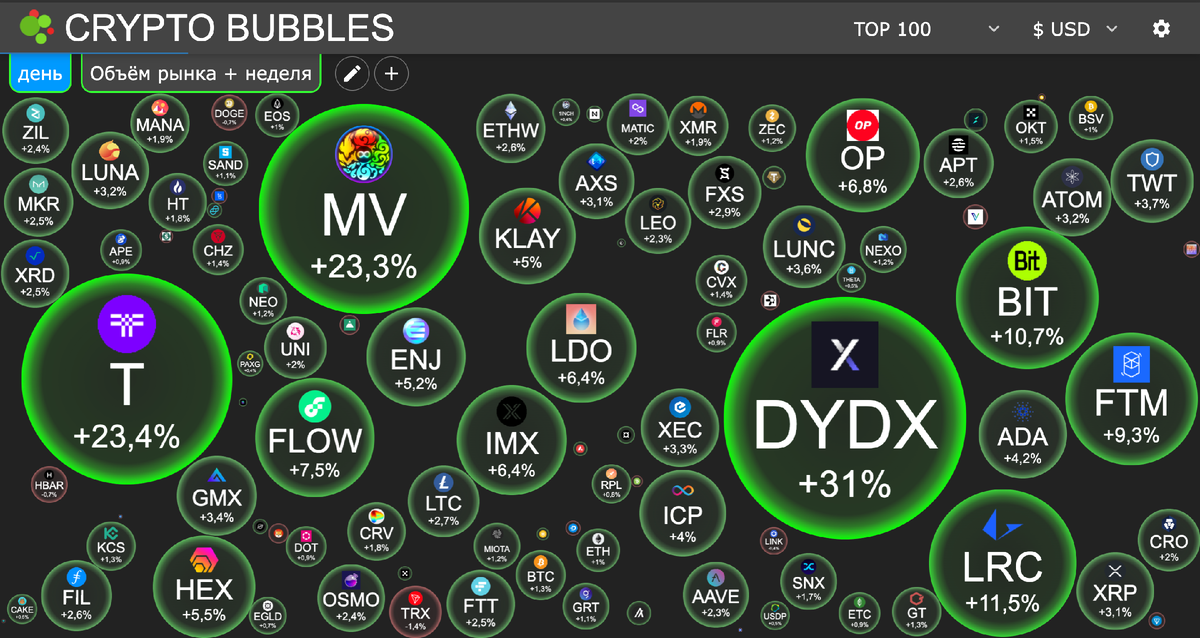 Bitcoin - стоимость 23 122 $, изменение за день +1,2% Ethereum - стоимость 1 583 $, изменение за день +1% Polygon - стоимость 1,10, изменение за день +1,7% Polkadot - стоимость 6,24 $, изменение за день +0,6% Litecoin - стоимость 97,07 $, изменение за день +2,8% Капитализация рынка - 1.051 млрд$ Индекс страха и жадности - 56(жадность)