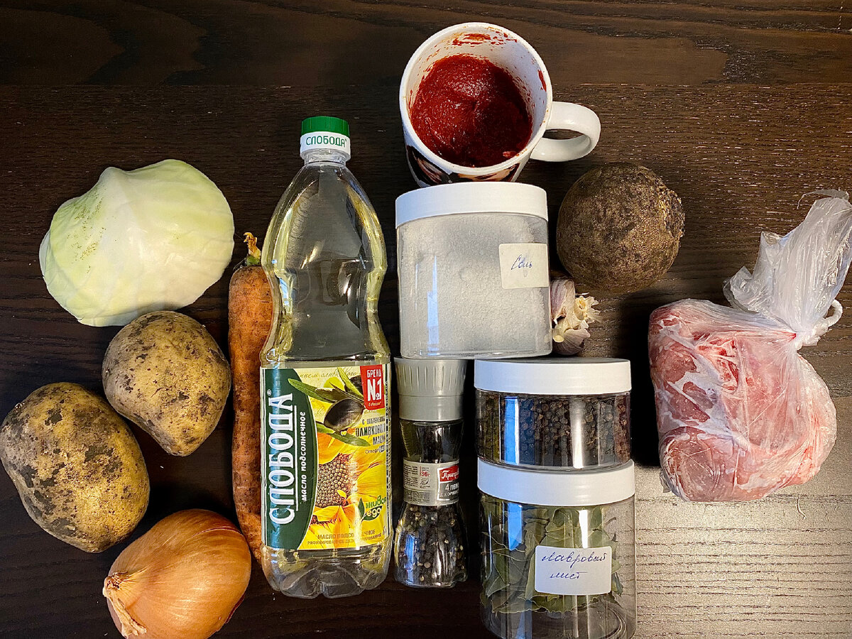 Ингредиенты: Свинина или говядина на кости – 500гр Капуста свежая – 250гр Масло растительное – 2 ст.л Лук репчатый – 1 средний Морковь – 1 средняя Свекла – 250 гр Картофель – 500 гр Томатная паста – 2 ст.л Чеснок – 4 зубчика Перец, соль – по вкусу Черный перец горошком – 3 шт Лавровый лист – 2 шт Приготовление: 1. Готовим бульон. Воду доводим до кипения, опускаем туда мясо, соль и перец горошком. Варим на небольшом огне 1,5 (свинина) - 2 (говядина) часа. 2. Лук нарезать небольшим кубиком. Морковь и свеклу натереть на крупной терке. Капусту нашинковать не очень крупно, картофель порезать кубиком. 3. Зажарка. В сковороду наливаем 2 ст.л растительного масла, опускаем лук, жарим 1-2 минуты, добавляем морковь и свеклу, обжариваем пару минут до мягкости овощей. Добавляем томатную пасту и обжариваем еще 2 минуты. Отставляем в сторону. 4. Как мясо будет готово - вынимайте его из кастрюли (и не забудьте также убрать перец горошком). Опускайте туда картофель и капусту, варите 15 мин на