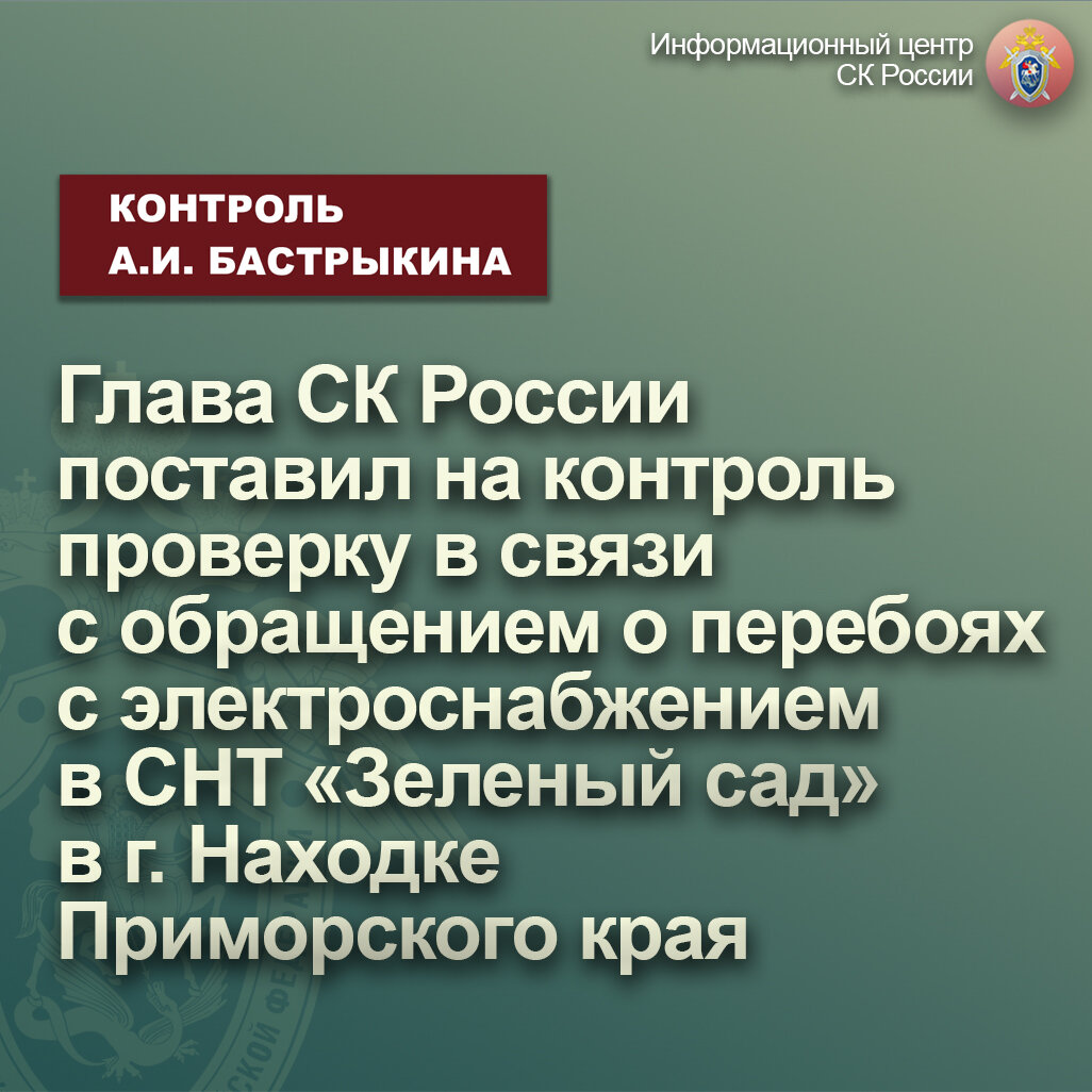 Глава СК России поставил на контроль проверку в связи с обращением о перебоях с электроснабжением в СНТ «Зеленый сад» в г. Находке Приморского края