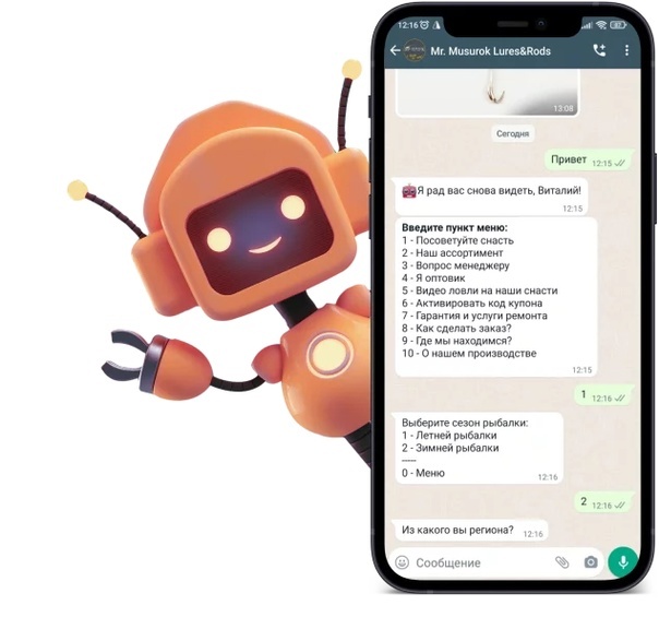 Торгово-производственная компания, предоставляющая рыболовные снасти на рынке уже более 20 лет. Производит уловистые и эксклюзивные снасти ручной работы Задачи: создать автоматизацию процесса продаж и увеличить продажи, оптимизировать затраты по времени Внедрили: • Чат бота WhatsApp Мы предложили разработать и внедрить многофункционального чат-бота для общения с клиентом в мессенджерах Instagram и WhatsApp