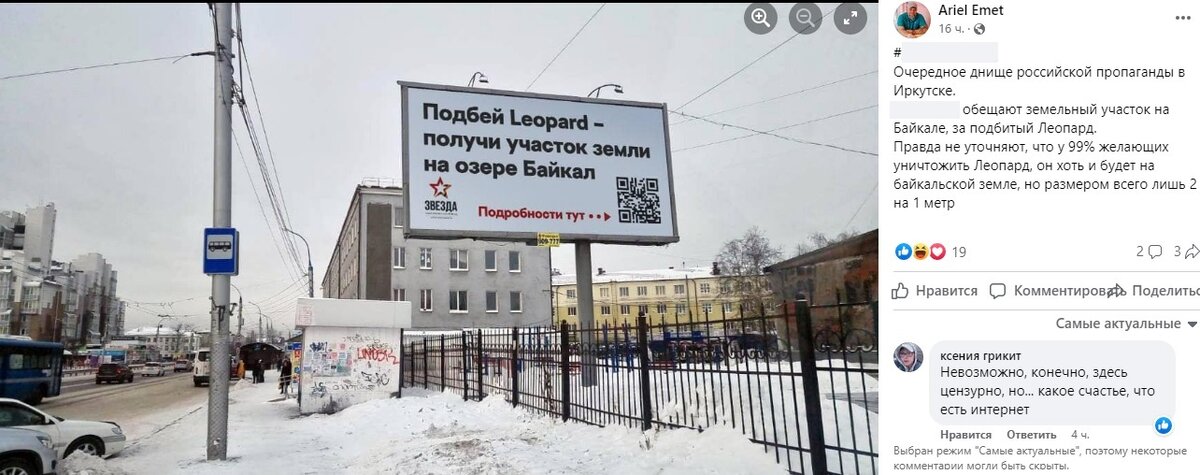 В соцсетях и телеграм-каналах опубликовали фотографию одной из улиц Иркутска, якобы на которой разместили баннер с надписью: «Подбей Leopard — получи участок земли на озере Байкал». Якобы акцию проводит местный благотворительный фонд «Звезда», созданный при поддержке губернатора Иркутской области. Иркутские журналисты побывали на этой улице. Они нашли там баннер с другой надписью: «Фонд реальной поддержки и помощи нашим ребятам, участвующим в СВО». Иркутский благотворительный фонд «Звезда» также заявил СМИ, что они не проводят акцию по раздаче земли за подбитые танки. Ircity.ru: В соцсетях появилось фото баннера из Иркутска, где обещали землю на Байкале за подбитый танк. Мы съездили на место и не нашли его