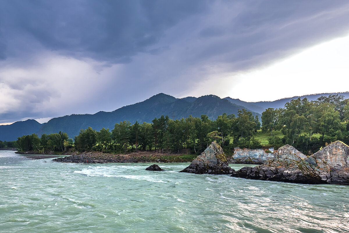 Двигаясь по Чемальскому району республики Алтай не могли мы не заглянуть в это известное место - "Зубы дракона". Представляет оно из себя каменную гряду торчащую из реки Катуни. Погода была не очень, но несколько снимков я сделал. зубы дракона # река катунь # достопримечательности # путешествия # республика алтай # горный алтай # природа # лето # чемал # чемальский район # автор фотографий: Евгений Мухортов. Река Катунь, Чемальский район, 14 августа 2018 год.