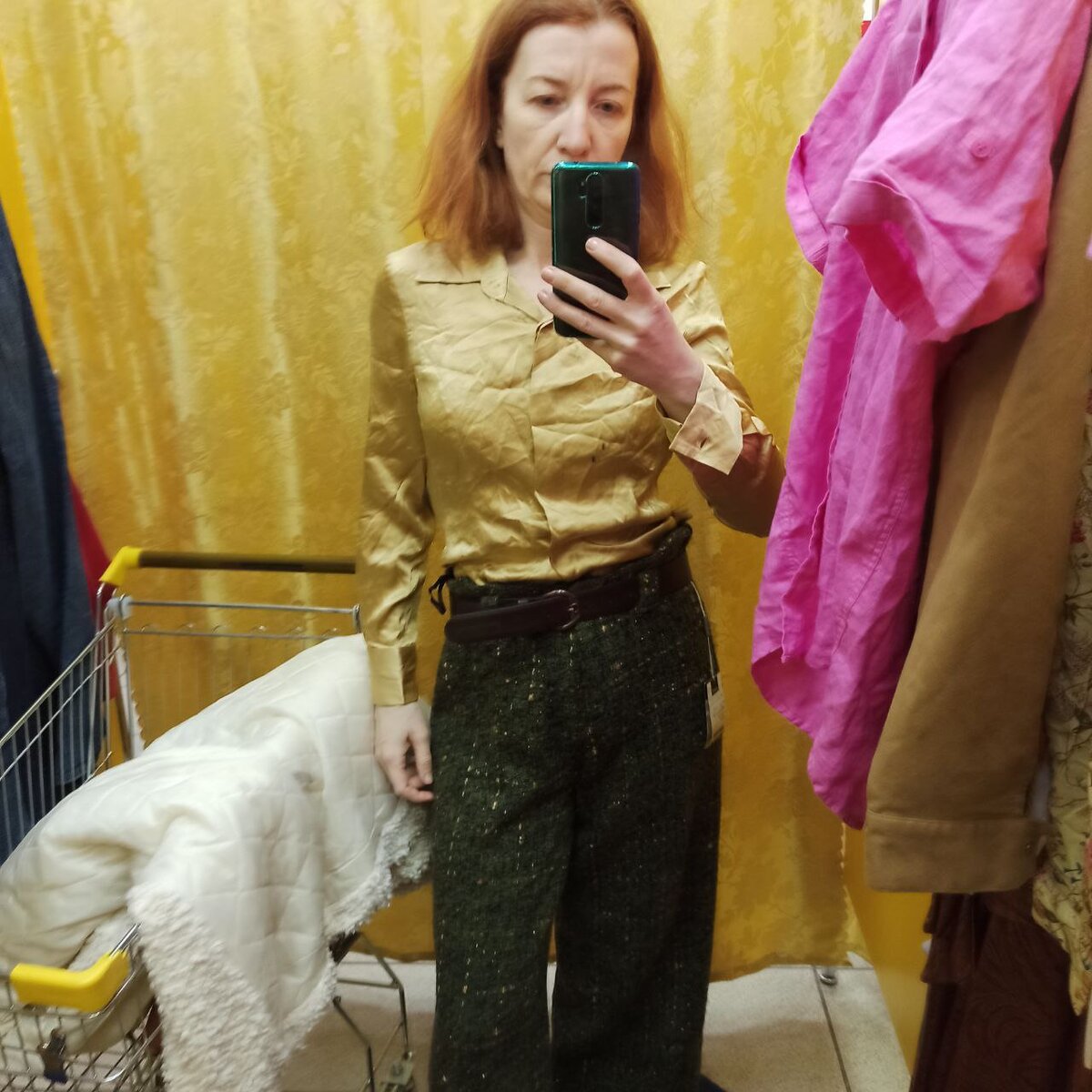 🍀Сладкая парочка первая. Шелковая блузка( узковата, а то бы забрала) и брюки букле, теплые. Отличный комплект 🍀Джинсы и фуксия из льна. Тоже прекрасный комплект. Дочка от блузки отказалась. Джинсы клеш, но низкие карманы на попе понижают посадку по-моему 🍀Рубашка тканевая под искусственную замшу 🍀Джинсы Calvin Klein и зелёный топ- тоже в паре отлично 🍀Рубашка маленькая,но прекрасного оранжево-красного цвета 🍀Рубашка Lewis, по-моему не оригинал, но сделано хорошо или все же винтаж? 🍀Ещё один комплект белые джинсы и блузка в цветочек. Джинсы огромные 🍀Джинсы Mango, уже обрезанные 🍀Ещё одна рубашка белая от Lee. Сомнения, что оригинал 🍀Теп