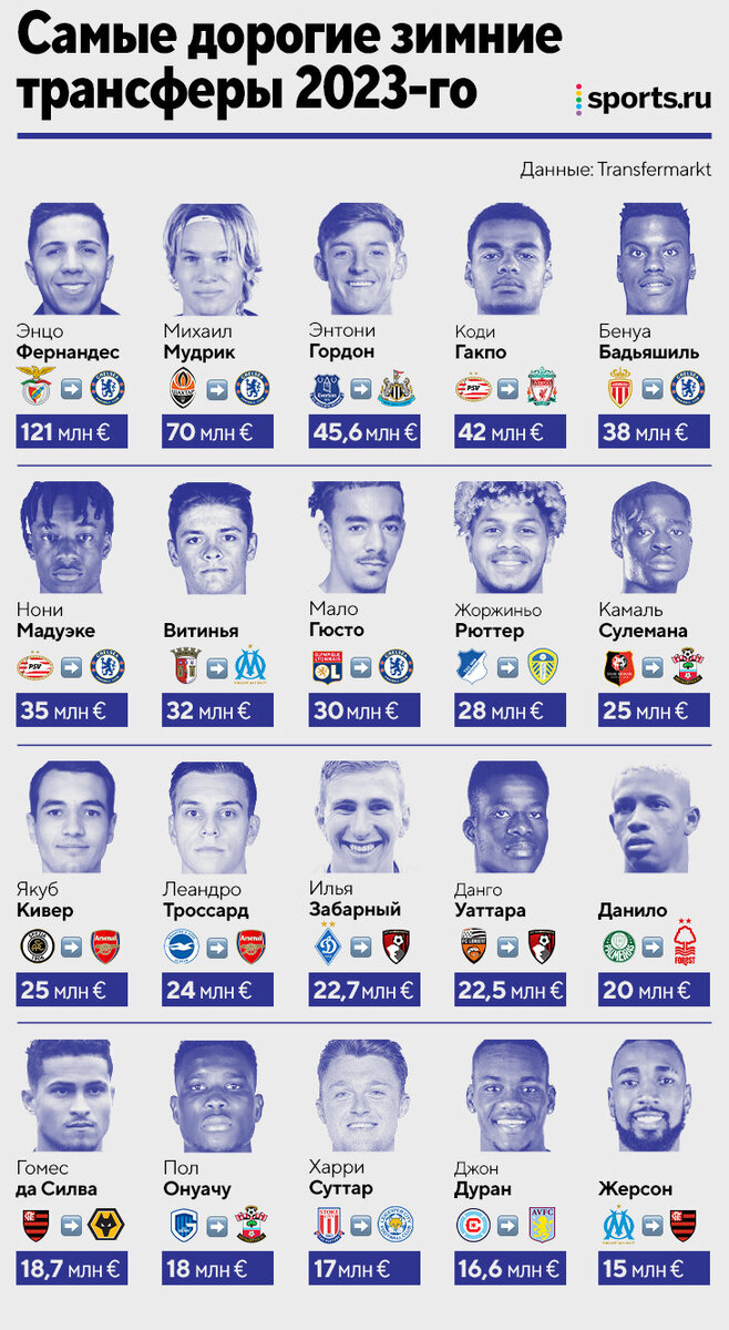 Зимнее трансферное окно захлопнулось. Самое время собрать двадцатку самых дорогих переходов. Выглядит она вот так: Несколько любопытных фактов: • Энцо Фернандес – самый дорогой трансфер этого окна и самое дорогое приобретение в истории «Челси». «Бенфика» упиралась весь январь, но все же сломалась – лондонцы выплатят португальцам 120 млн несколькими траншами. • 666,1 млн евро – столько в общей сложности заплатили клубы за первую двадцатку самых дорогих трансферов. • 5 из 20 трансферов в списке провернул «Челси» – Тодд Боули потратил зимой больше 320 млн евро! • 18 из 20 самых дорогостоящих переходов оформили клубы АПЛ. Два оставшихся трансфера – у «Марселя» и «Фламенго». • Неплохо наварился ПСВ – заработал с трансферов Коди Гакпо и Нони Мадуэке 78 млн евро. «Челси» утащил Энцо Фернандеса! Главное о невероятной зимней закупке Фото: Gettyimages.ru/Clive Mason