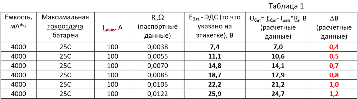 Где Uбат – напряжение на батареи при подключенной нагрузке, В; Eбат- ЭДС батареи напряжение, которое покажет вольтметр при подключении к клеммам батареи без нагрузки!!! I цепи – ток протекающий через батарею при подключенной нагрузке, для нашего случае надо рассматривать максимальный ток отдачи батареи; Ri – наконец-то добрались до внутреннего сопротивления батареи, измеряется в омах (W). Теперь для наглядности приведем таблицу фактического напряжения на клеммах батареи при максимальной токоотдачи, возьмем например батареи фирмы Hyperion G3 с токоотдечей 25С